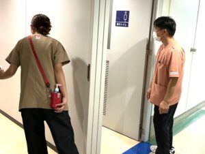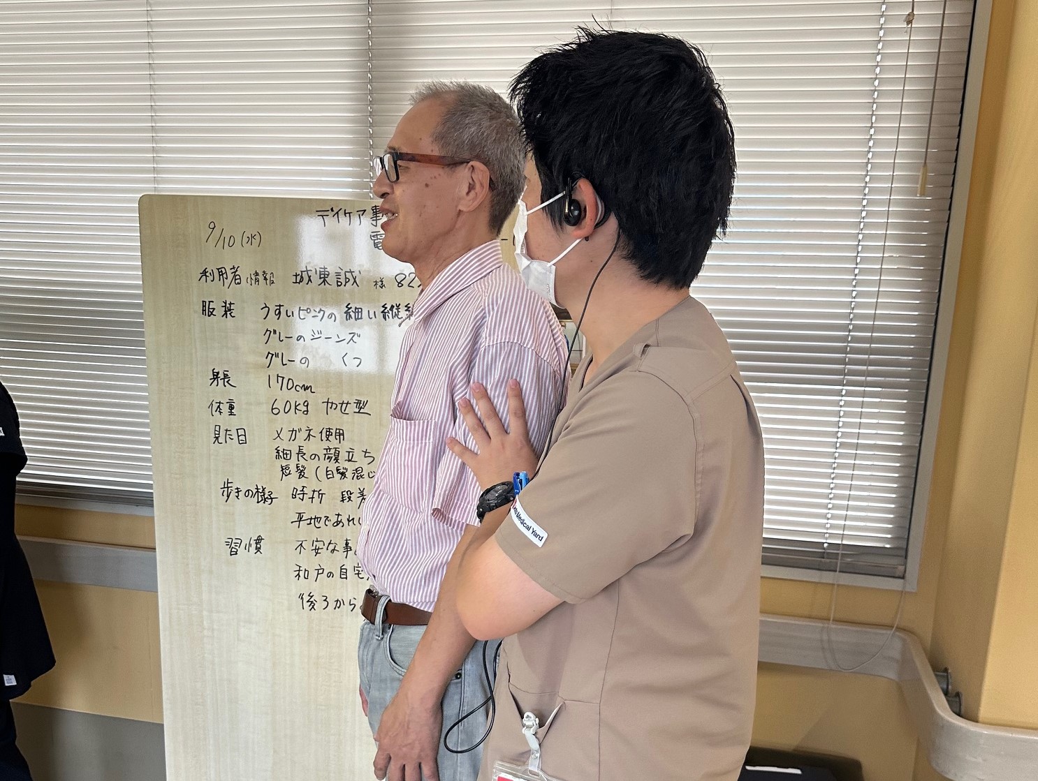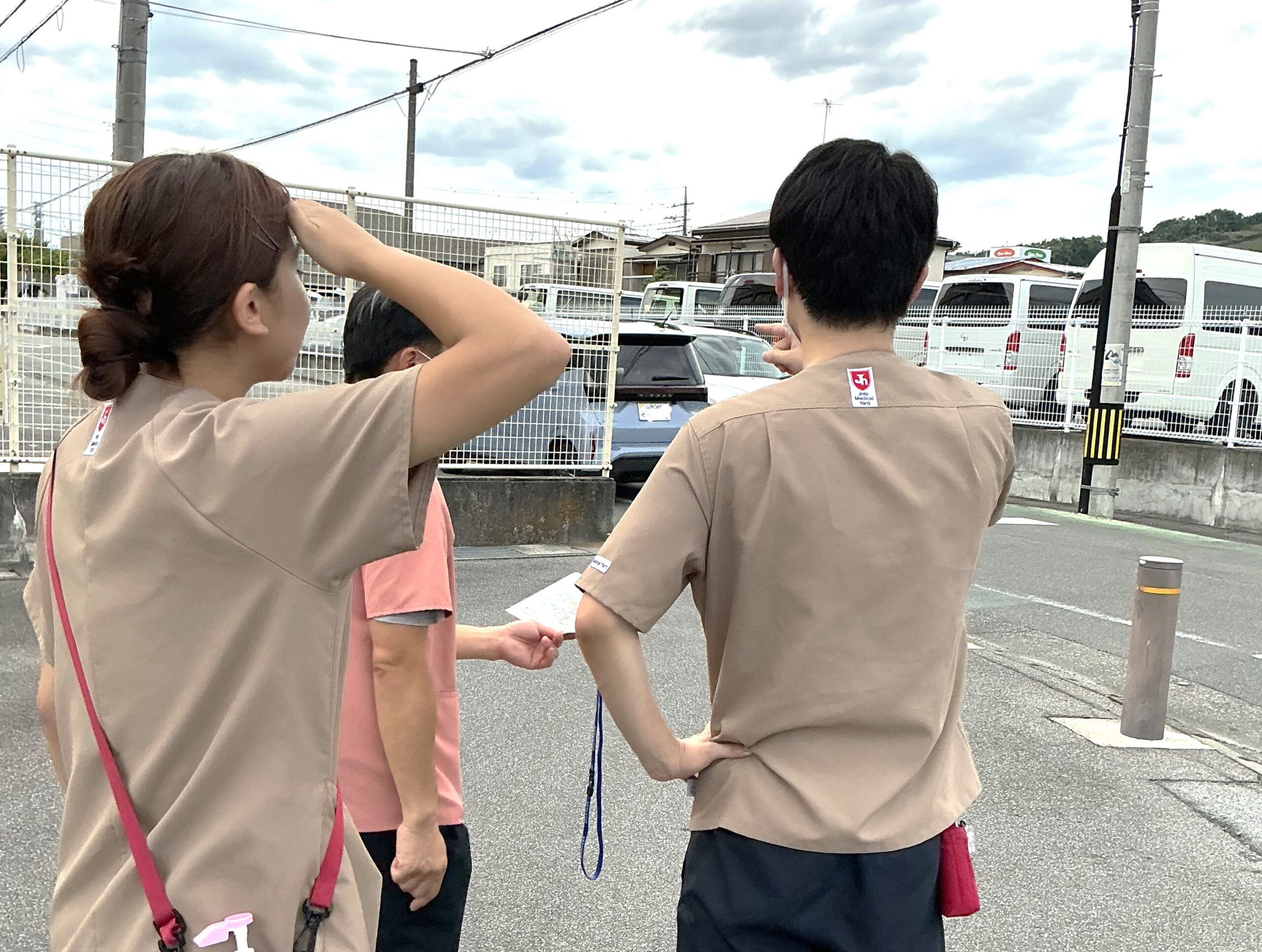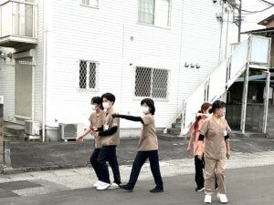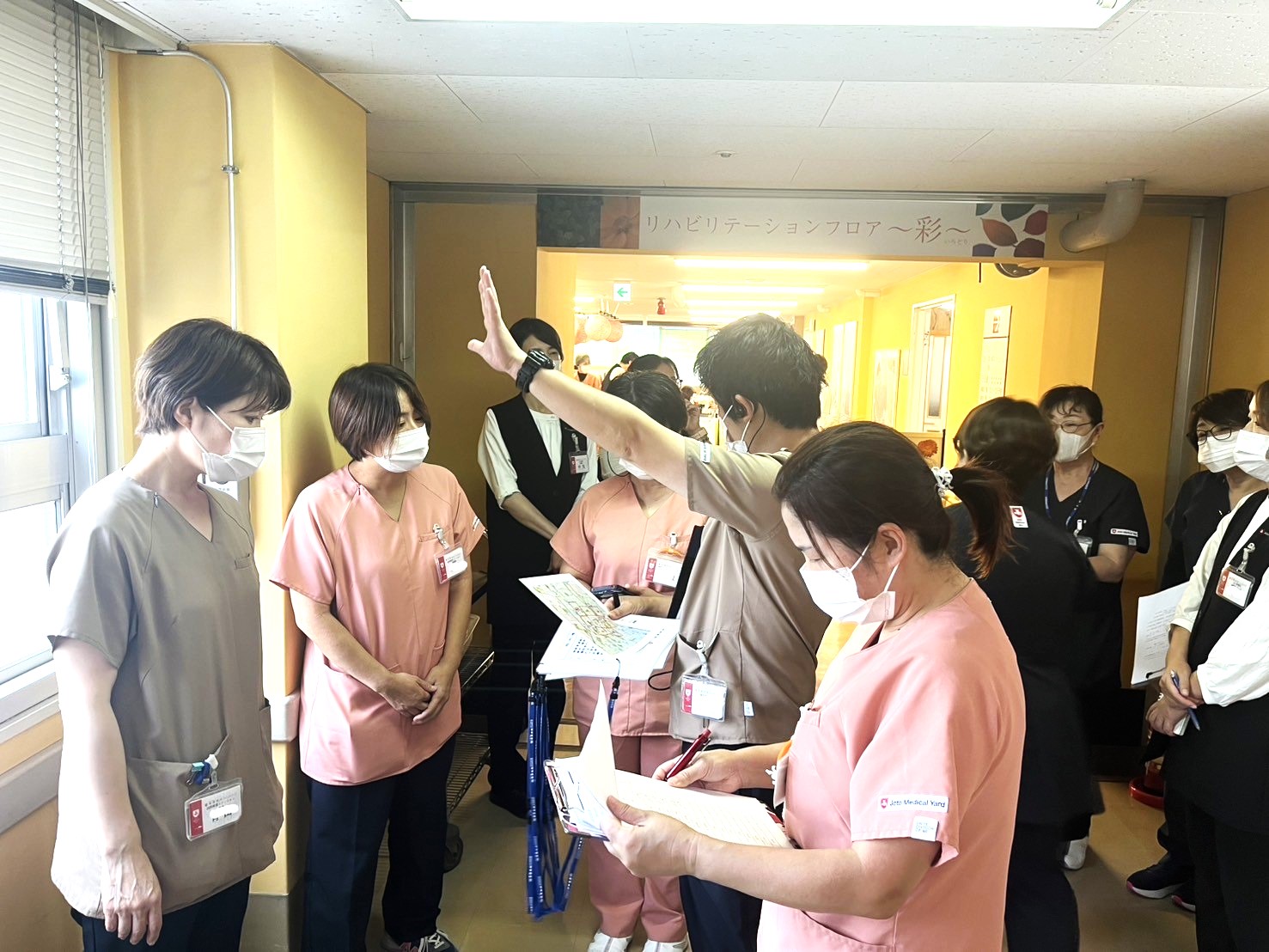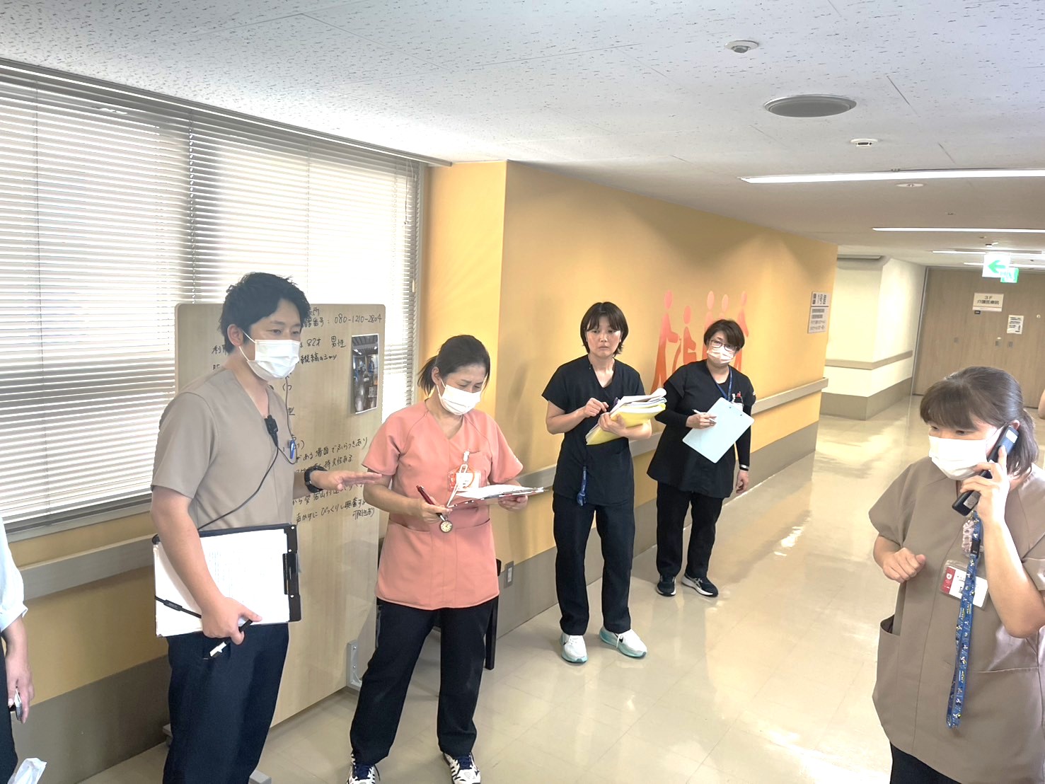 訓練では、まず発見者が管理者に報告し、速やかにコードイエローを発令。院内、敷地内捜索後、職員が担当区域を分担し、施設の外を捜索しました。無事に利用者様を発見・保護するまでの流れを確認し、それぞれの役割や連携の重要性を再認識しました。