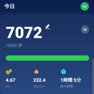 このウォーキングでの歩数は7072歩でした。健康寿命を延ばす効果があるといわれている6000~8000歩、今日は達成です!