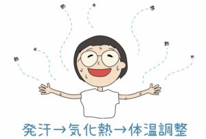 汗の水分が皮膚の上で蒸発すると、一緒に熱が奪われ体温が保たれます。