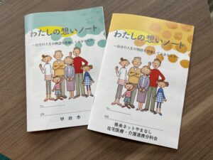 『わたしの想いノート』は昨年甲府市が発行したACPノートで、お薬手帳程のノートに、自分の大切な物事、価値観、人生観、そして「もしも」のときに伝えたいことを書き記すことができます。