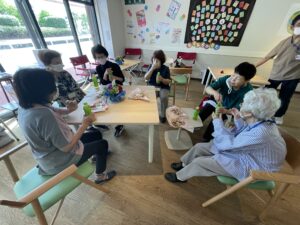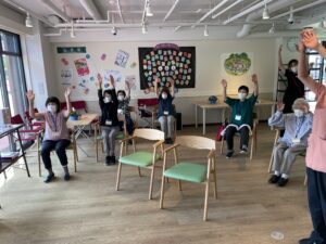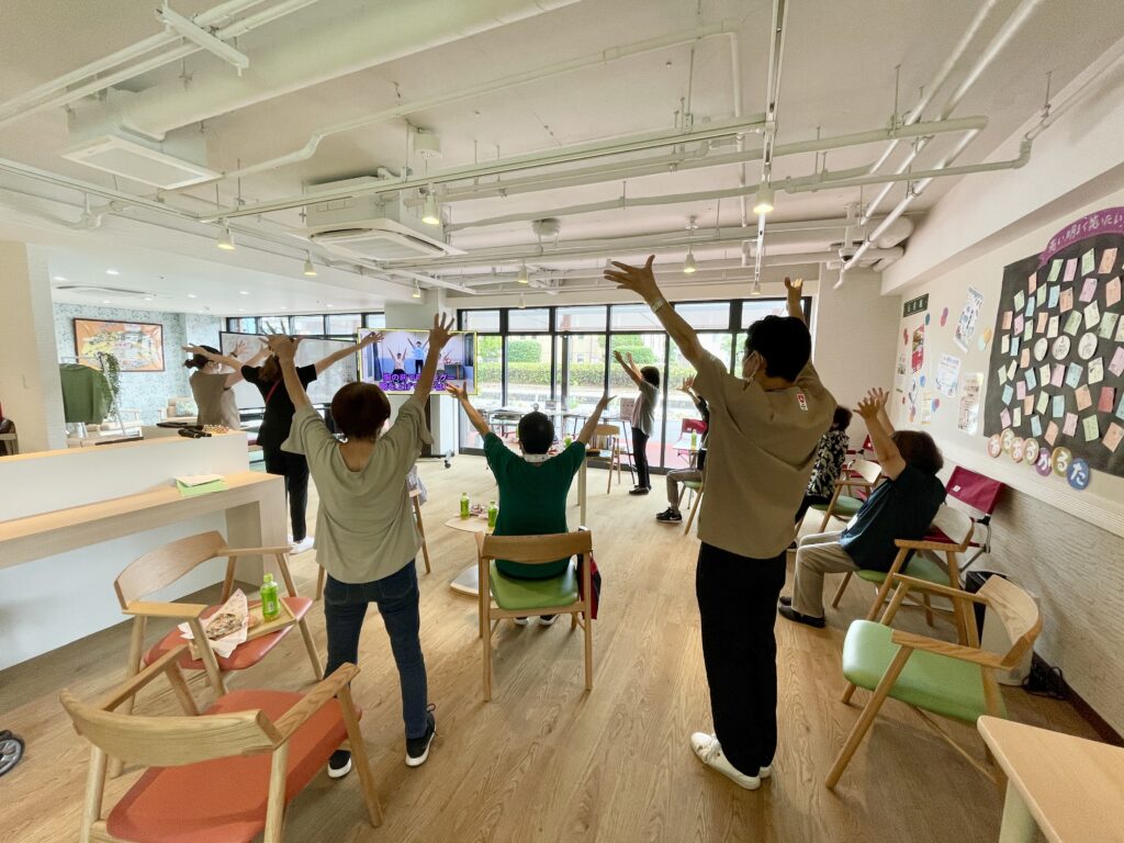 この日は城東病院の新しくできた交流スペース『でらいとステーション』を会場に、『暑さに負けず、歌って踊ってフレイル予防♪』をテーマに開催しました。