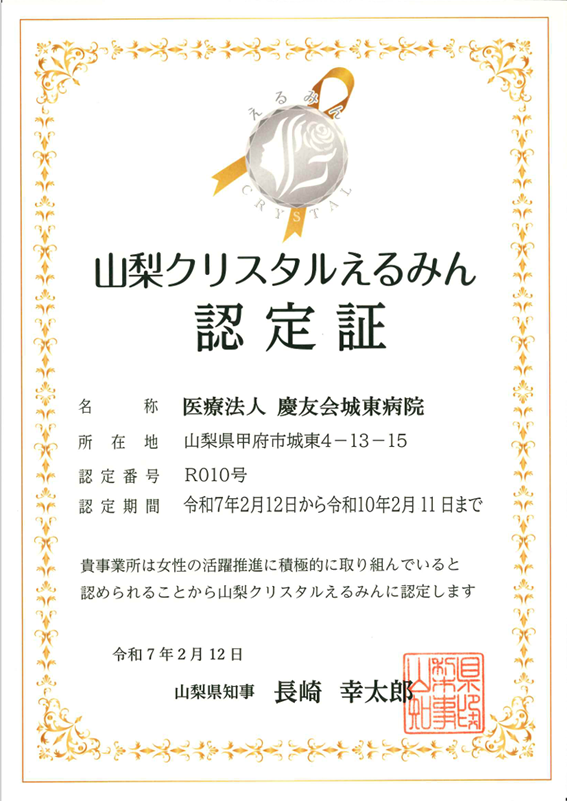 城東病院は、山梨クリスタルえるみん認定企業としての責任を持ち、これからも職員全員が働きやすい職場環境を目指し取り組んでいきます。